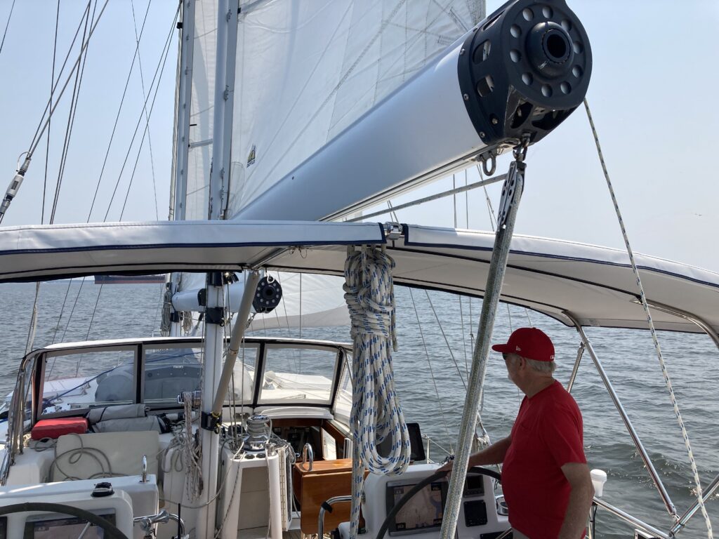 John and Linda Kelleher live in Arlington, Va in the same neighborhood as my son Demian and over the years we have become good friends. John had volunteered to help me sail the boat North to New York but since that trip had to be canceled, I invited them both over for an afternoon sail in Annapolis Bay. It was a beautiful day, although the winds were very light, we had the sails up in time for an easy, enjoyable sail before a light rain shower moved through.